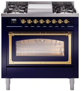 Introducing the new Nostalgie II 36" dual fuel range, a classic addition with a touch of innovation to any kitchen. This range feature sealed burners equipped with total black brass burner that has a non-stick nanotechnological coating, heavy cast iron grates, 3.5 cu. ft. total oven capacity and soft closing door system.Read More