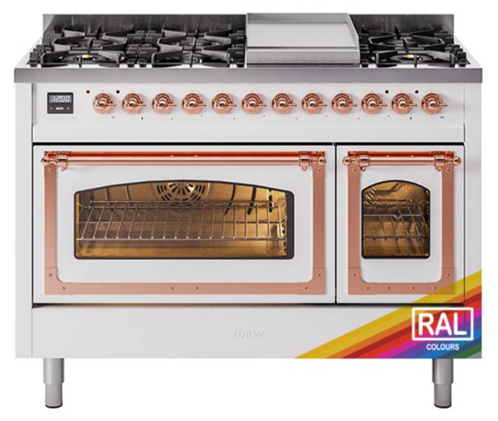 Introducing the new Nostalgie II 48" dual fuel range, a classic addition with a touch of innovation to any kitchen. This range feature sealed burners equipped with total black brass burner that has a non-stick nanotechnological coating, heavy cast iron grates, 3.5 + 1.52 cu. ft. total double oven capacity and soft closing door system.Read More